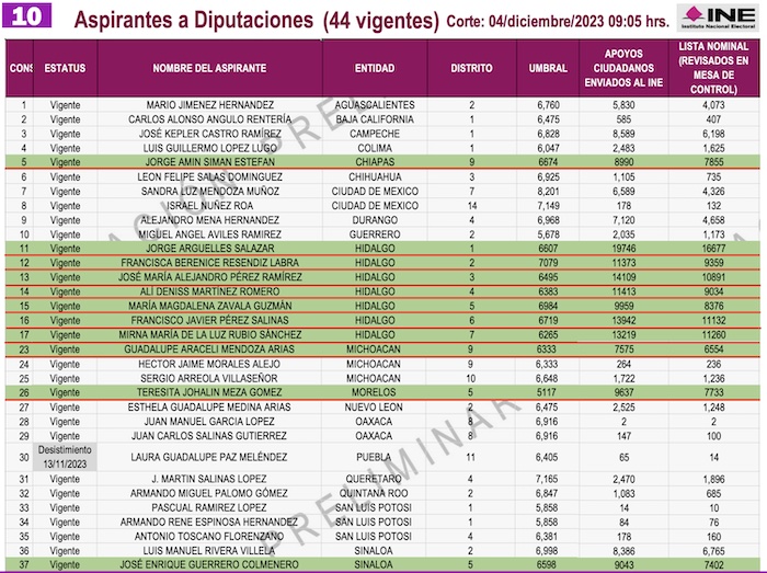 Otros aspirantes que sumaron cuotas suficientes de apoyo para ser candidatos independientea a diputaciones federales son Jorge Amín Siman Estefa, de Chiapas; Guadalupe Araceli Mendoza Arias, de Michoacán; Teresita Johalín Meza Gómez, de Morelos y Jorge Enrique Guerrero Colmenero, de Sinaloa.
