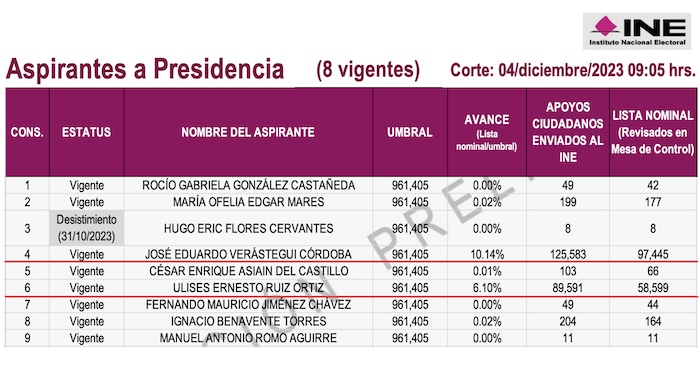 También parece imposible que pueda haber candidatos independientes al Senado de la República, pues de seis que se inscribieron, uno ya se dio de baja en su intento de reunir las firmas suficientes y sólo uno tiene un avance razonable, del 59.75 por ciento, cuando faltan 17 días para que se venza el plazo para cumplir con el trámite de reunir firmas de apoyo, el próximo 21 de diciembre del 2023.