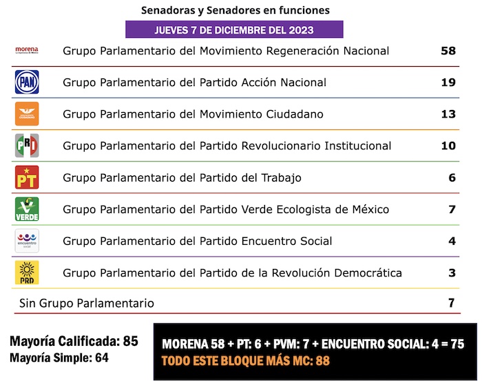Igual sucede en la Cámara de Senadores, donde la mayoría calificada se logra con 85 de 128 legisladores y para alcanzar esa cifra, Morena debe colocar a algunos de sus candidatos a través del PT y del PVEM, además de darles a esos dos partidos espacios para que compitan por separado en algunas entidades, donde Morena podría obtener las dos senadurías de mayoría y buscar que alguno de sus aliados se lleve la senaduría de primera minoría.