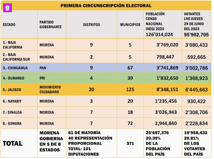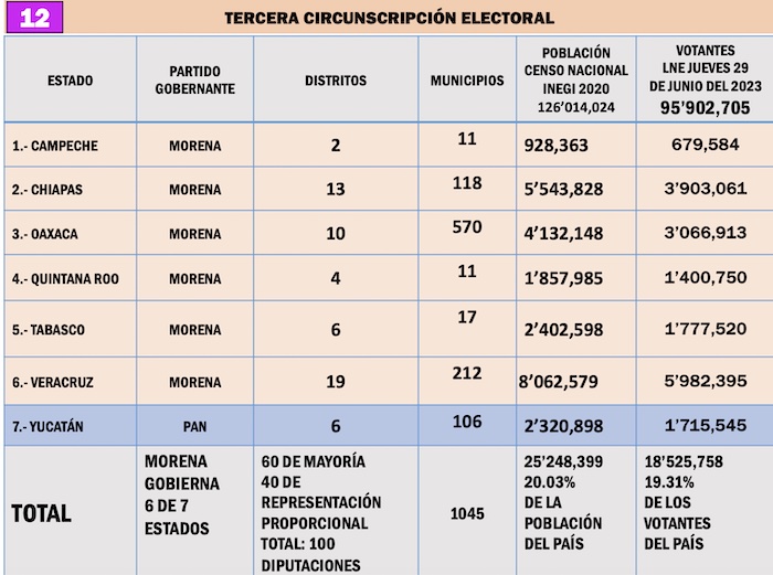 Morena y sus aliados gobiernan y tienen fuerte presencia territorial y política en 23 de las 32 entidades federativas del país, lo que les permite disfrutar de una posición privilegiada en las cinco Circunscripciones Electorales en las que está dividido el país y en las cuales se disputan, en cada una de ellas, en promedio, 100 diputados federales, entre Legisladores de Mayoría Relativa y Representación Proporcional.