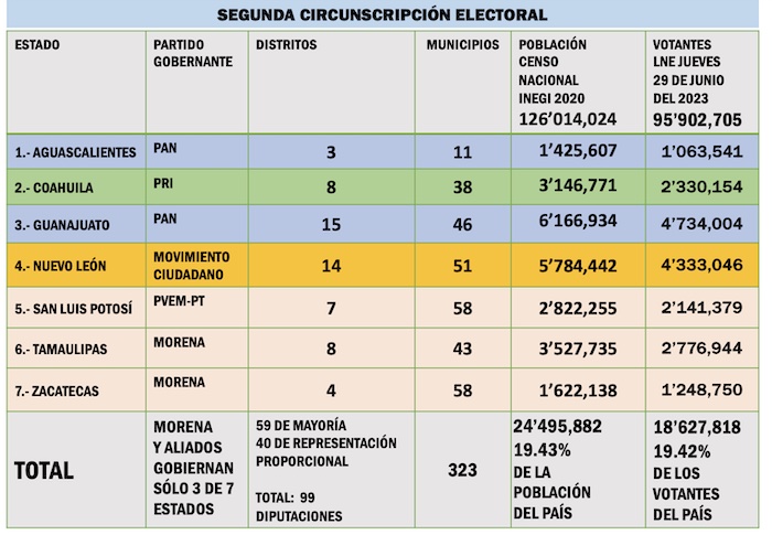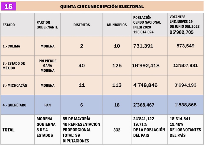 La salida de Querétaro de la Segunda Circunscripción Electoral debilitó al PAN en la región del país en la cual era más fuerte para competir por las diputaciones de Mayoría Relativa y de Representación proporcional y, amplió las posibilidades de triunfo para Morena y sus aliados. Pero además la incorporación de Querétaro a la Quinta Circunscripción Electoral no le causa mayores inconvenientes a Morena, que en esa región ganó en junio pasado el Estado de México, entidad en la cual estarán en juego 40 diputaciones de Mayoría Relativa. El Estado de México es también la cabecera regional de la Quinta Circunscripción Electoral, en la cual se reparten 40 diputaciones de Representación Proporcional.