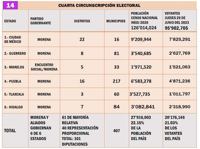 El cambio del estado de Hidalgo de la Quinta Circunscripción Electoral a la Cuarta Cicunscripción Electoral fortalece a Morena en esa región, en la que es cabecera la Ciudad de México y en la cual los morenistas y sus aliados estarían en una inmejorable posición para ganar la gran mayoría de las 100 diputaciones que estarán en juego: 60 de Mayoría Relativa y 40 de Representación Proporcional. En esta Circunscripción Morena gobierna 6 de 6 estados.