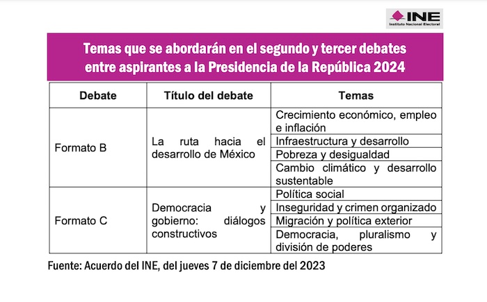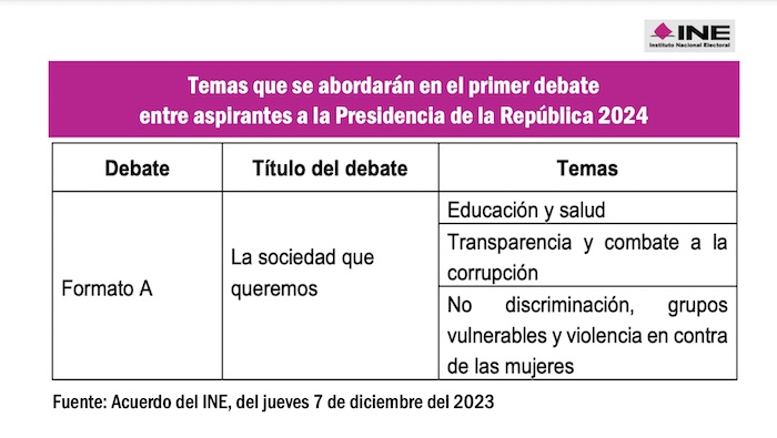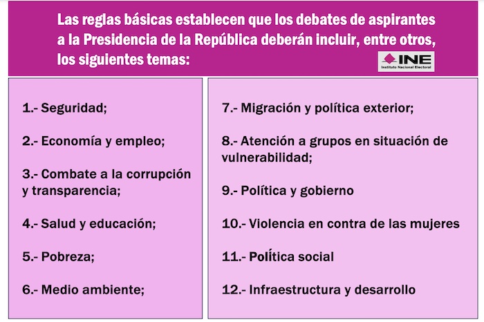 El Consejo General del Instituto Nacional Electoral (INE) aprobó el pasado jueves 7 de diciembre del 2023 que los debates deberán incluir los siguientes temas: