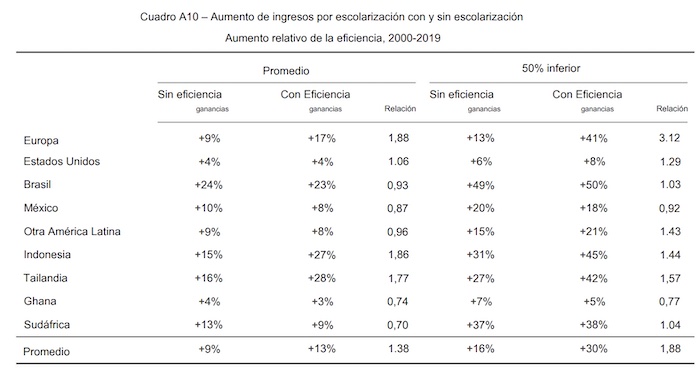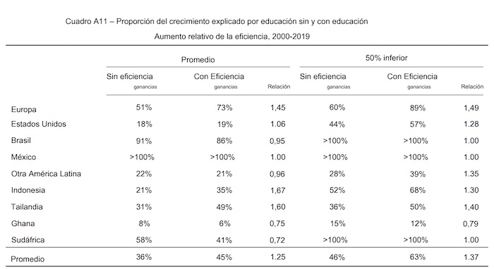 En el caso de México, el aumento de ingresos por escolarización y sin aumentos relativos de eficiencia de 2000 a 2019 fue de un 10 por ciento. En tanto, el aumento de ingresos sin escolarización fue del 8 por ciento.