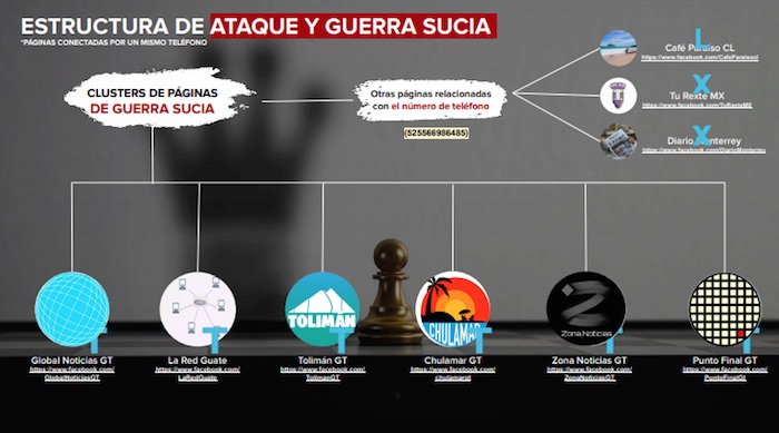 Mario Delgado señaló que con la información pública de estas páginas, se pudo conocer que nueve de ellas se conectan por medio de un mismo número de teléfono y un mismo correo electrónico, mientras que las otras 8 páginas están conectadas por otro número de teléfono, mientras que por lo menos seis de éstas tienen urls de Chile y Guatemala, en el caso de estas segundas vinculadas a la derecha de ese país.