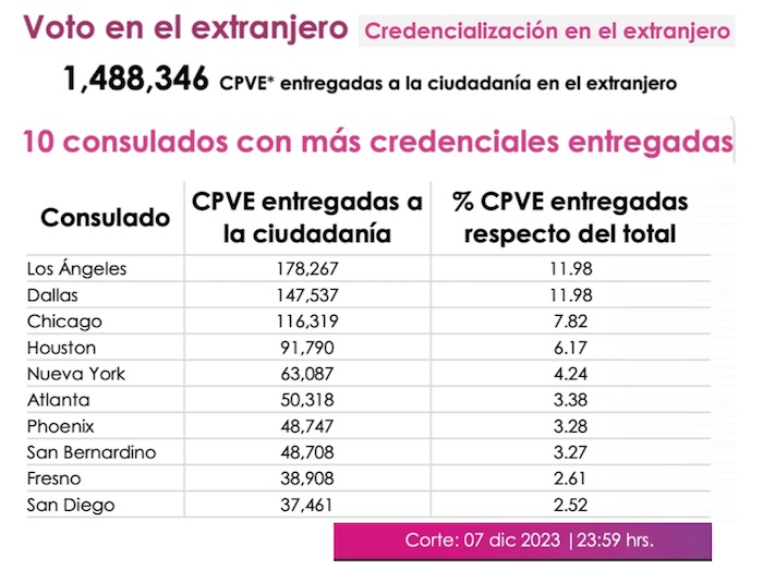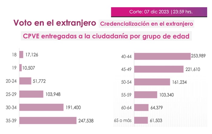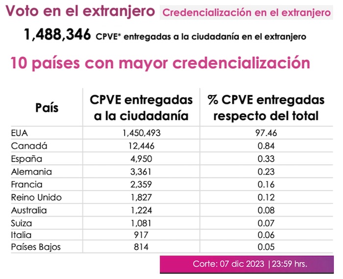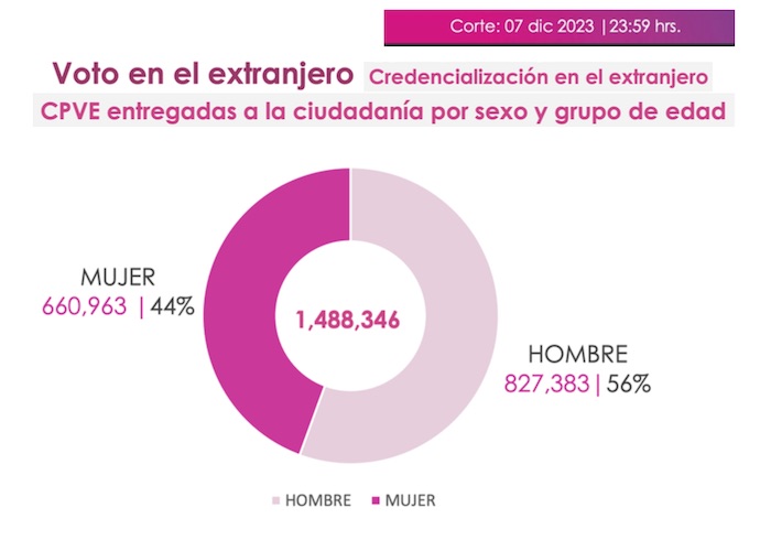 Ciudad de México, 14 de diciembre (SinEmbargo).– Un millón 488 mil personas ya han recibido su credencial para votar en el extranjero, hasta el corte del jueves 7 de diciembre del 2023, según la última actualización proporcionada por el Instituto Nacional Electoral (INE), pero sólo 55 mil 318 ciudadanos han realizado el trámite formal de inscribirse en la Lista Nominal de Electores, para sufragar en los comicios del domingo 2 de junio del 2024.