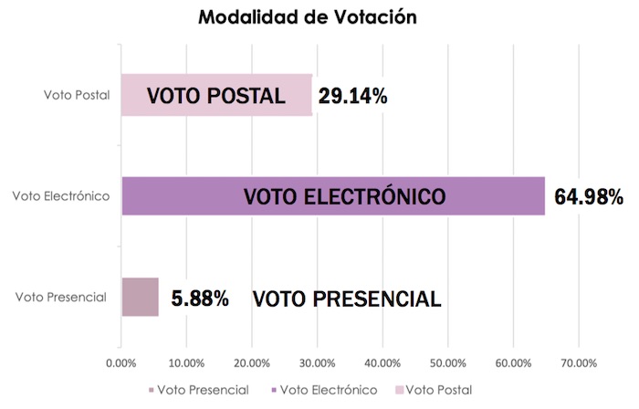 Hasta el momento, según el último reporte del INE, el 64.98 por ciento de quienes ya están inscritos en la Lista Nominal para votar en el extranjero han optado por el voto electrónico, a través de internet.