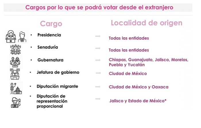 De la misma manera, habrá compatriotas de seis estados que también podrán votar para Gobernador, como son los casos de Chiapas, Guanajuato, Jalisco, Morelos, Puebla y Yucatán y para la Jefatura de Gobierno de Ciudad de México, siempre y cuando sean oriundos de esa entidad federativa.