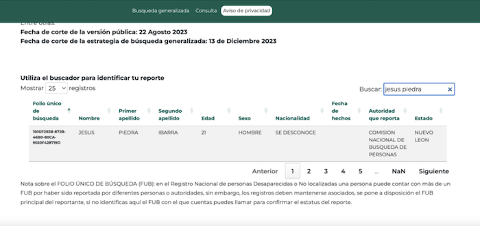 Ciudad de México, 19 de diciembre (A dónde van los desaparecidos).- Registros duplicados, apellidos mal escritos, información insuficiente o búsquedas que únicamente se completan al poner el nombre sólo en mayúsculas o minúsculas. La “Versión pública especial para consulta” del Registro Nacional de Personas Desaparecidas y No Localizadas (RNPDNO) puesta en línea por el Gobierno federal como parte de la Estrategia Nacional de Búsqueda Generalizada de Personas Desaparecidas es una muestra más de las deficiencias del “nuevo censo” del Presidente Andrés Manuel López Obrador.