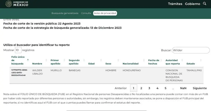 En la versión especial para consulta del RNPDNO, el registro de Wilder no incluye la fecha de los hechos ni su edad, aunque la Secretaría de Relaciones Exteriores (SRE) fue una de las bases de datos que se consultó para elaborarla.