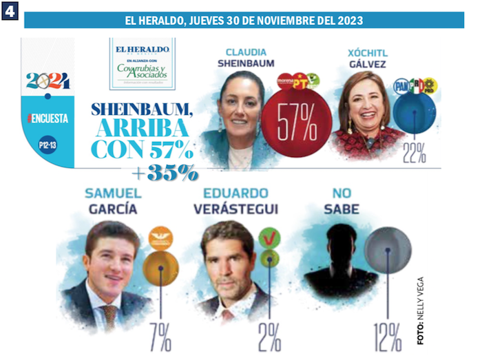 El mes de noviembre del 2023 cerró con la publicación, el jueves 30, en el periódico capitalino El Heraldo de México, de una encuesta realizada por la consultora Covarrubias y Asociados, que le acreditó a Claudia Sheinbaum una ventaja de 35 puntos porcentuales en las preferencias electorales rumbo a la Presidencia de la República. Frente al 57 por ciento de la abanderada de Morena-PT-Partido Verde, la precandidata de PAN-PRI-PRD apenas sumó el 22 por ciento de las preferencias.