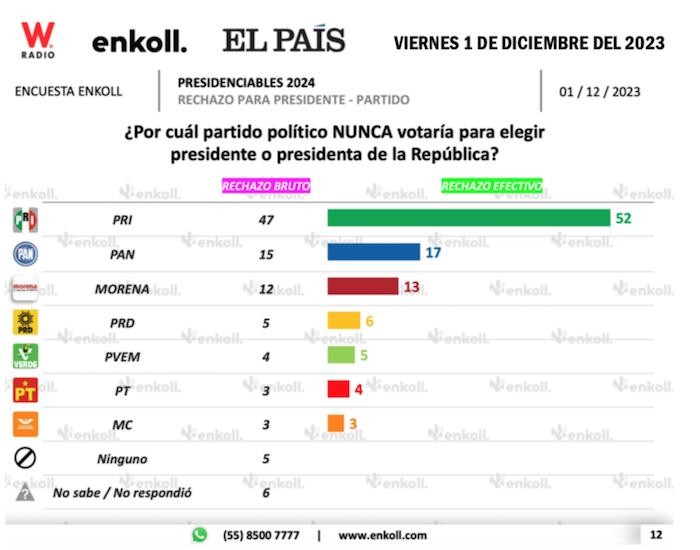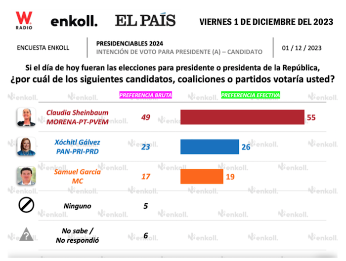 El viernes 1 de diciembre del 2023 se publicó la encuesta de la consultora Enkoll, para el periódico El País y para el grupo W Radio, en la cual Claudia Sheinbaum marcó 26 puntos de distancia con respecto a Xóchitl Gálvez. La abandera de Morena-PT-PVEM tuvo un registro de 49 puntos porcentuales contra 23 de la precandidata presidencial de PAN-PRI-PRD. Además, la encuesta de Enkoll evidenció que Xóchitl carga sobre sus espaldas el desprestigio del Partido Revolucionario Institucional, pues el 47 por ciento de los entrevistados dijo que nunca votaría por el partido tricolor. Además, el segundo partido con más rechazo fue el PAN, con un 15 por ciento de personas que señalaron que nunca le darían su respaldo al albiazul.