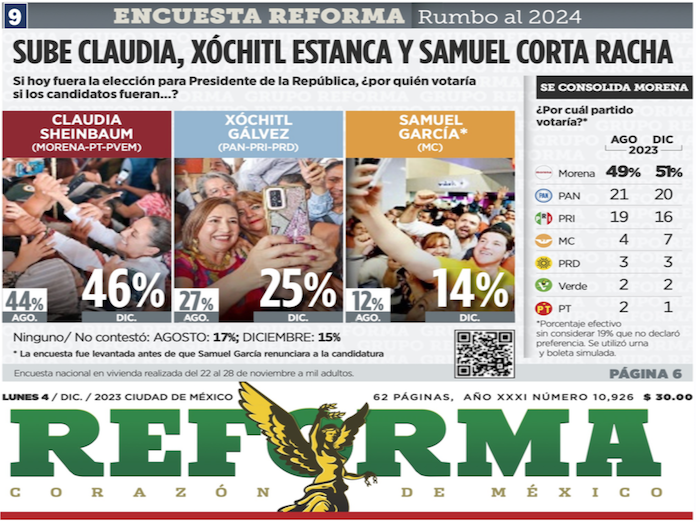 Una encuesta publicada por el periódico Reforma el lunes 4 de diciembre del 2023 enfrió los ánimos de la alianza opositora, pues en portada y arriba de su cabezal principal, aparecían los resultados que atribuían 46 por ciento de las preferencias a Claudia Sheinbaum Pardo y apenas 25 por ciento a Xóchitl Gálvez Ruiz. Una distancia de 21 puntos porcentuales. Además, la encuesta reflejaba otro dato importante: entre agosto y diciembre Claudia había sumado dos puntos, en tanto que Xóchitl los perdió en el mismo periodo. Como partido, Morena tenía el 51 por ciento de las preferencias, contra 20 por ciento del PAN y 16 por ciento del PRI.