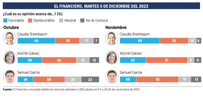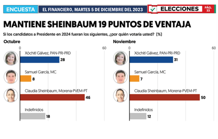 Las estadísticas que presentó el periódico capitalino El Financiero el martes 5 de diciembre del 2023 fueron las más benignas en el mes para Xóchitl Gálvez, pues le acreditó una preferencia electoral del 31 por ciento contra el 50 por ciento de Claudia Sheinbaum. Una distancia de 19 puntos porcentuales. Sin embargo, la encuesta de El Financiero reflejó dos datos singulares: entre octubre y noviembre aumentaron un 3 por ciento las opiniones favorables a Claudia, y en el mismo periodo subieron 9 por ciento las opiniones negativas con respecto a Xóchitl.