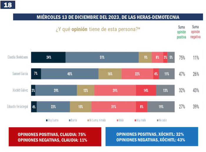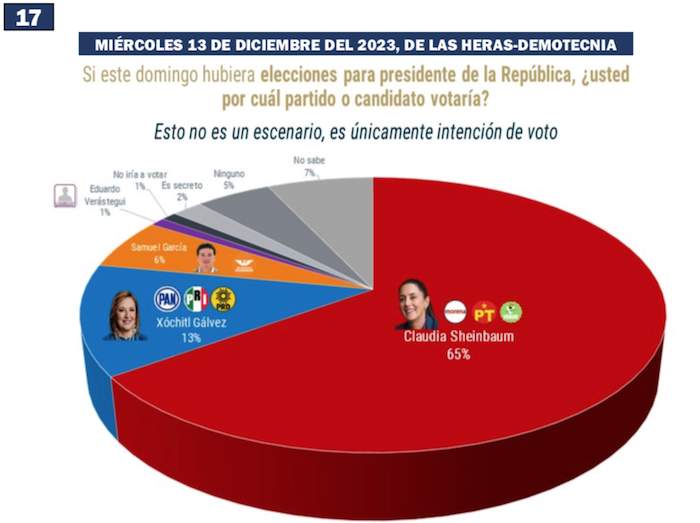 Los datos más favorables para Claudia y demoledores para Xóchitl durante el último mes del 2023 los registró la encuesta de De las Heras Demotecnia, publicada el miércoles 13 de diciembre, con 65 por ciento de las preferencias en la contienda presidencial para la abanderada de Morena y apenas un 13 por ciento para la aspirante de la coalición opositora que encabeza el PAN. Un 52 por ciento de ventaja para Sheinbaum Pardo debe haber desencantado a los seguidores de Gálvez Ruiz.