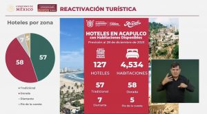 La Gobernadora de Guerrero, Evelyn Salgado, informó por su parte que ya están en funcionamiento 127 hoteles en el mítico puerto, con una disponibilidad de 4 mil 534 habitaciones pronosticadas para el 28 de diciembre: 57 en la zona tradicional, 58 en la zona dorada, 7 en la zona diamante y 5 en Pie de la Cuesta.