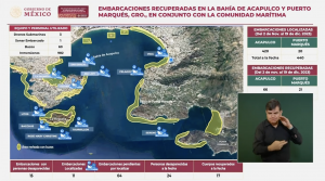 El Secretario de Marina, José Rafael Ojeda Durán, detalló que en la Bahía de Acapulco y Puerto Marqués se han realizado 982 inmersiones con 60 buzos. Se han localizado 440 embarcaciones en total, 420 en Acapulco, y se han recuperado 66 embarcaciones en ese mismo sitio. Se han localizado 11 de 15 embarcaciones reportadas con personas desaparecidas: a su vez, 17 cuerpos han sido recuperados.