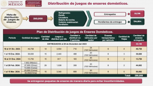 Luis Crescencio Sandoval, Secretario de la Defensa, dio a conocer que se han entregado hasta ahora 55 mil 196 enseres domésticos –incluidos refrigeradores, estufas, licuadoras, baterías de cocina, colchones matrimoniales y ventiladores– y hay 194 mil 804 por entregar. Los enseres restantes se irán entregando a lo largo de la segunda quincena de diciembre y hasta la primera quincena de marzo de 2024, para llegar a los 250 mil entregas previstas.