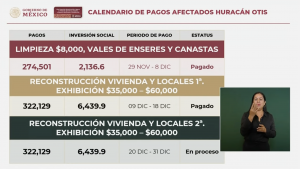 La Secretaría del Bienestar informó que los vales de limpieza, enseres y canastas ya fueron pagados ente noviembre y diciembre; y se pagó la primera exhibición para la reconstrucción de viviendas y locales –apoyo que va de los 35 mil a los 60 mil pesos–, y se hará entrega de la segunda parte entre el 20 y el 31 de diciembre. Los beneficiarios de este apoyo son 309 mil 262.