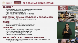 "Estamos trabajando para que pronto se logre el renacimiento de Acapulco, del puerto, atendiendo desde luego de manera preferente a la población. (…) Calculo que llevamos ejercidos como 20 mil millones y comprometidos otros 20 mil, y 20 mil por ejercer", anunció en su conferencia diaria el mandatario mexicano, donde se presumió el avance del 100 por ciento del alumbrado en el puerto, así como la entrega de enseres domésticos, becas, pensiones y apoyos directos para reconstrucción de casas en la zona devastada.