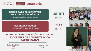 A su vez, la Secretaria de Educación Pública, Leticia Ramírez, indicó que van 597 escuelas, públicas y privadas, que han retornado a clases, un 37.1 por ciento del total, y los registros de comités de padres de familia se prevén completarse para enero de 2024.
