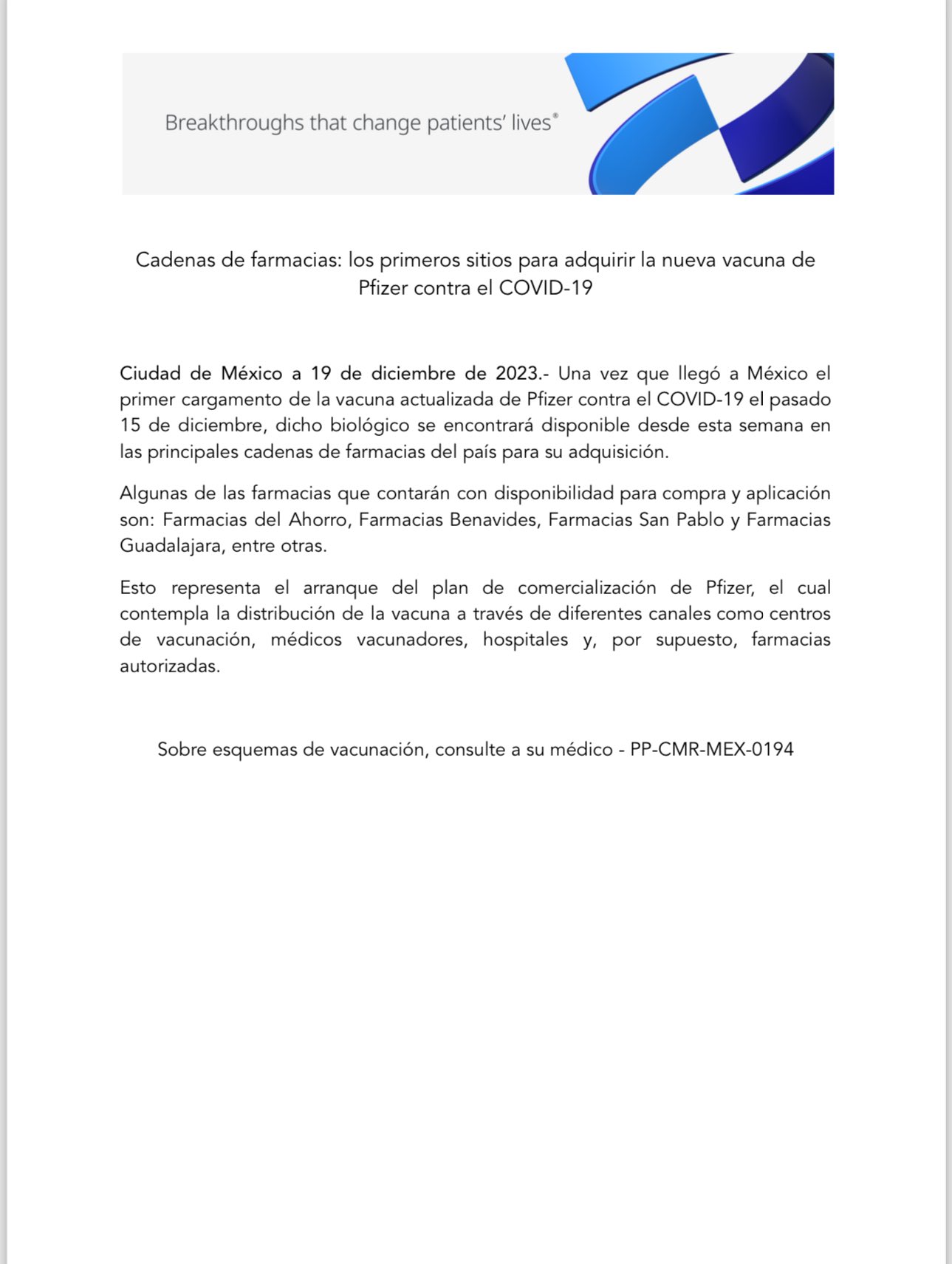 “Una vez que llegó a México el primer cargamento de la vacuna actualizada de Pfizer contra la COVID-19 el pasado 15 de diciembre, dicho biológico se encontrará disponible desde esta semana en las principales cadenas de farmacias del país para su adquisición”, indicó Pfizer en un comunicado.