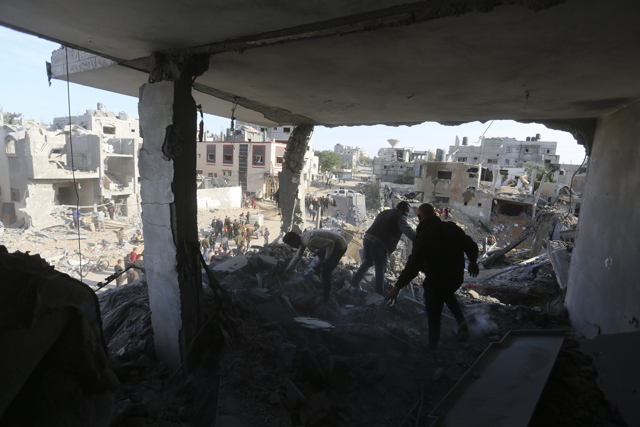 Palestinos buscan sobrevivientes del bombardeo israelí sobre la Franja de Gaza en Rafah, el martes 12 de diciembre de 2023. Foto: Hatem Ali, AP.