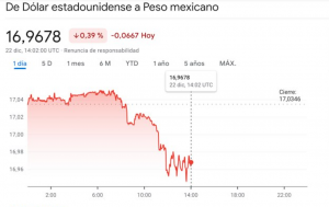 El tipo de cambio de dólar a peso mexicano, se ubicaba en las 16.95 unidades, con el que la divisa nacional mostraba una apreciación de 0.39 por ciento, algo que la paridad peso-dólar no había alcanzado desde finales de agosto.