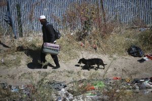 Un migrante con un transporte para mascotas seguidos de un perro camina a lo largo del muro fronterizo con Estados Unidos, vistos desde el lado de Ciudad Juárez, México, el 27 de diciembre de 2023. Foto: Christian Chávez, AP