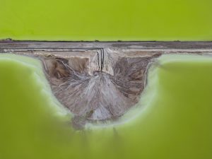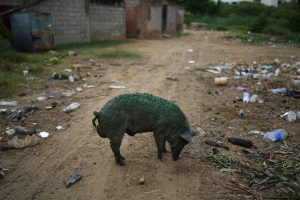 La contaminación lago Maracaibo, en Venezuela, pintó de verde un cerdo que olfatea en busca de comida a la orilla de unas aguas cubiertas de verdín.