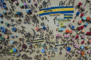 Un manifestante vestido como el Joker, el villano de la saga de Batman, con una bandera panameña en una protesta con un contrato-ley de minería entre el gobierno y la filial local de la compañía canadiense First Quantum, en Ciudad de Panamá, el 31 de octubre de 2023. Semanas después, la Corte Suprema de Panamá declaró inconstitucional el contrato minero. Foto: Arnulfo Franco, APFans argentinos del club Boca Juniors reunidos en la playa de Copacabana un día antes de que su equipo se enfrentara al Fluminense en la final de la Copa Libertadores de fútbol, en Rio de Janeiro, Brasil, el 3 de noviembre de 2023. Foto: Bruna Prado, AP