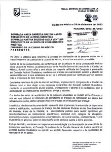 “Considerando que el día nueve de enero de 2024 fenece el encargo que me fue conferido, y toda vez que resulta necesario garantizar la continuidad en las funciones de procuración de justicia, asimismo teniendo presente que someterme al proceso de ratificación es un derecho que me asiste y que corresponde a ese Órgano soberano pronunciarse sobre la opinión que emitieron el Consejo Judicial Ciudadano y el Jefe de Gobierno de la Ciudad de México", manifestó.