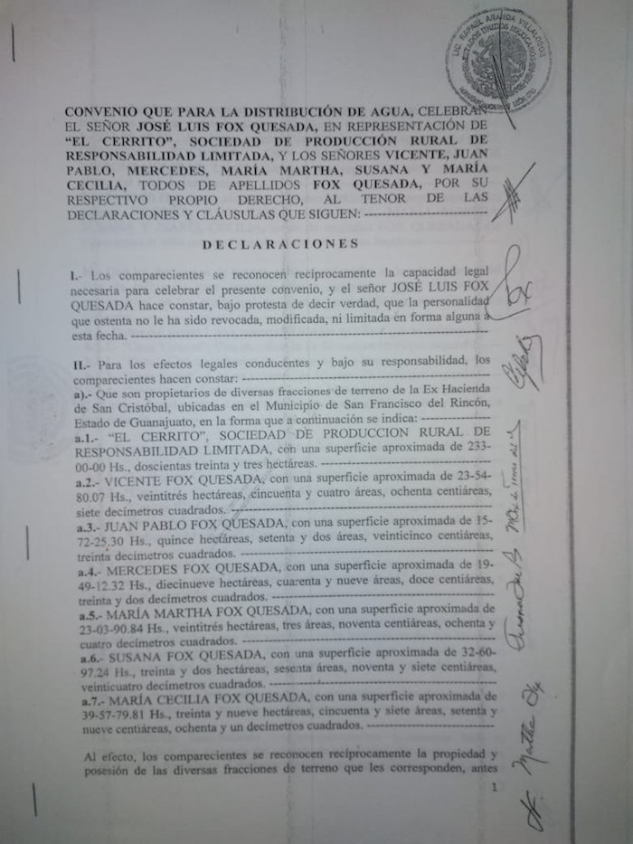 De acuerdo con el convenio firmado el 23 de diciembre de 2015 –al que SinEmbargo tuvo acceso– los seis hermanos Fox Quesada tienen destinados 90.73 litros por segundo: Vicente, 13.8 litros por segundo; Juan Pablo, 9.2; Mercedes, 11.4; María, 13.5; Susana, 19.2 y María Cecilia, 23.3.