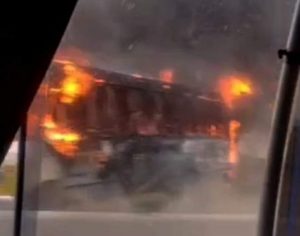 – Carretera Panamericana Celaya-Salamanca cerca del puente del Libramiento Sur; ahí quedó un autobús de pasajeros incendiado.