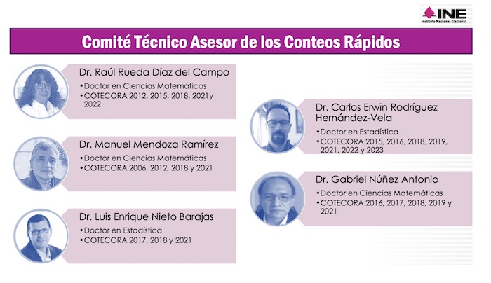 También forman parte de este Comité Técnico Asesor de Conteos Rápidos los doctores en matemáticas Gabriel Núñez Antonio, Michelle Anzarut Chacalo, Raúl Rueda Díaz del Campo, Manuel Mendoza y los doctores en estadística Luis Enrique Nieto Barajas y Carlos Erwin Rodríguez Hernández-Vela.