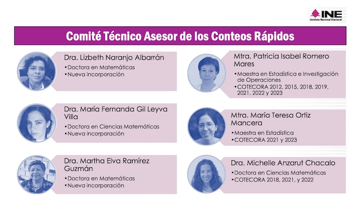 Integran el Comité Técnico Asesor de los Conteos Rápidos del INE las doctoras en matemáticas Lizbeth Naranjo Albarrán, María Fernanda Gil Leyva Villa y Martha Elva Ramírez Guzmán, así como las maestras en estadística Patricia Isabel Romero Mares y María Teresa Ortiz Mancera.