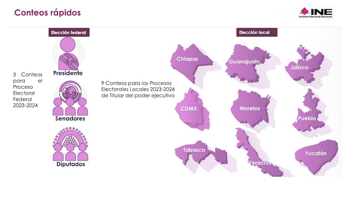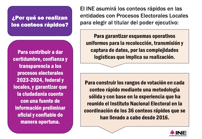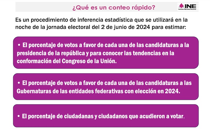 El INE advierte que los conteos rápidos son procedimientos estadísticos diseñados con la finalidad de estimar con oportunidad las tendencias de los resultados finales de una elección federal o local, a partir de una muestra probabilística de resultados de Actas de Escrutinio y Cómputo de Casilla, o en su caso, de los cuadernillos para hacer las operaciones de escrutinio y cómputo de casilla, cuyo tamaño y composición se establecen de manera previa, conforme a un esquema de selección específico de una elección determinada, y cuyas conclusiones se presentan la noche de la jornada electoral respectiva.