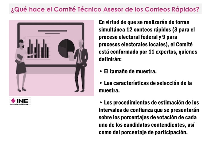 El INE designó a especialistas en matemáticas y estadística, que integran el Comité de expertos encargado de definir los criterios científicos que permitan obtener tendencias confiables y precisas de los resultados el día de la elección. En virtud de que se realizarán de forma simultánea doce conteos rápidos este Comité Técnico está integrado por 11 expertos, quienes definirán, entre otras cosas: el tamaño de la muestra; las características de selección de la muestra; los procedimientos de estimación de los intervalos de confianza que se presentarán sobre los porcentajes de votación de cada uno de los candidatos contendientes, así como del porcentaje de participación.