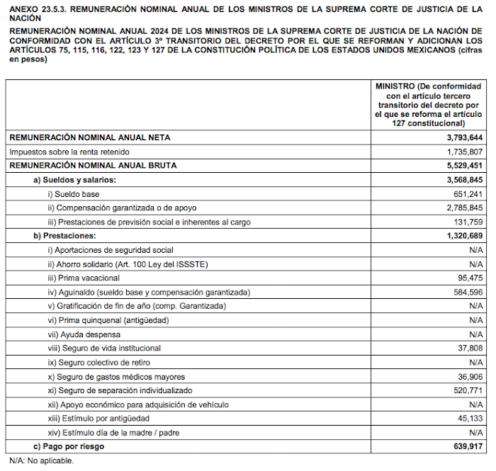 Para este año, por ejemplo, cada uno de los 11 ministros percibirá, de acuerdo con el Presupuesto aprobado en el Congreso, un salario mensual neto de 206 mil 948 pesos, un monto de 445 mil 309 pesos por prima vacacional-aguinaldo, un pago por riesgo de 416 mil 754 pesos, además de un Seguro de vida institucional, un Seguro de gastos médicos mayores, un Seguro de separación individualizado así como un estímulo por antigüedad.