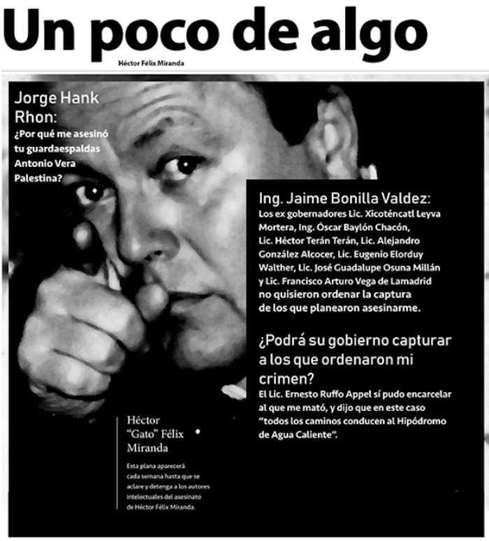 La revista Zeta de Tijuana, tiene una página con esa frase, la fotografía de Héctor Félix Miranda, conocido como “El Gato” Félix, asesinado en 1988.