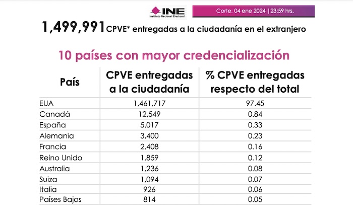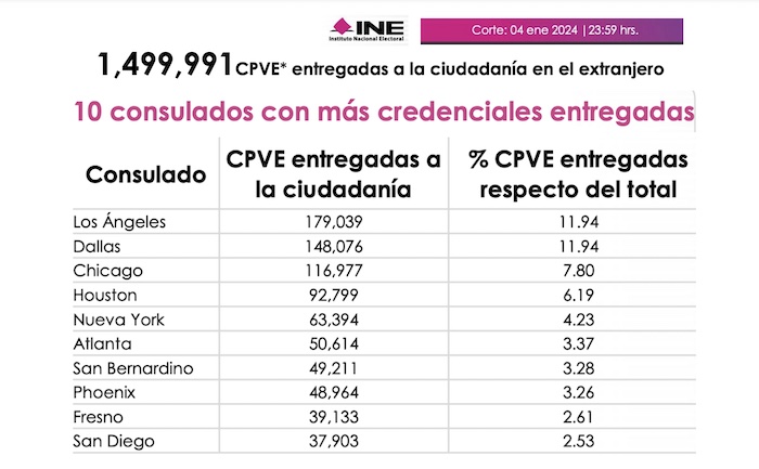 Igual, en la página oficial del INE también se advierte que, además de la jornada especial que realizará hoy la Secretaría de Relaciones Exteriores en todas sus embajadas y consultados, los ciudadanos tendrán hasta el 20 de febrero de 2024 para acudir a las representaciones de nuestro país en el extranjero más cercanas a sus domicilios para tramitar su credencial para votar sin necesidad de hacer cita previa.