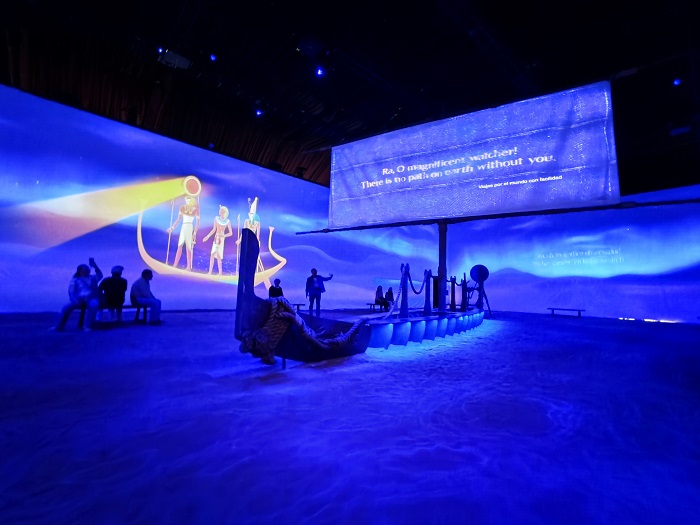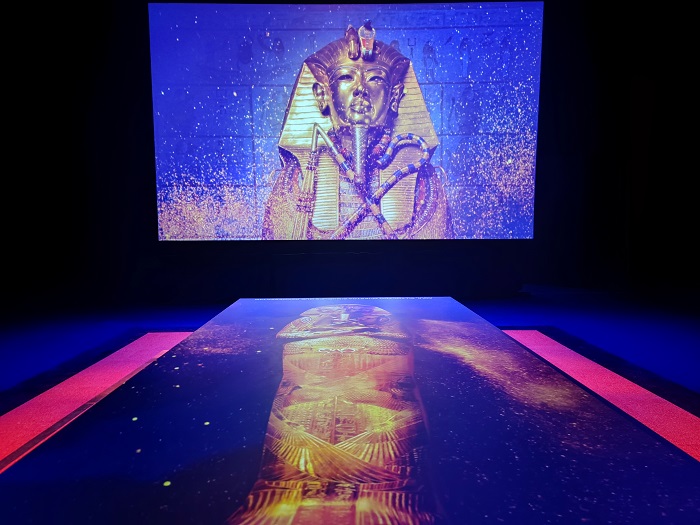 Conforme se avanza en las salas es posible observar fotografías de objetos, un plano que explica cómo estaba constituida la tumba, también hay un espacio como si fuera la cámara funeraria del Rey Tutankamón con proyecciones en las 4 paredes, hasta una habitación muy amplia en la que caminas sobre arena (usaron 21 toneladas de arena para este espacio inmersivo) y encuentras el barco que llevó al rey.