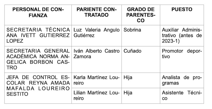 También personal de confianza del Rector se ha adjudicado clases en la Universidad, desplazando a docentes con mayor antigüedad y mérito para impartir esas materias, sin que tampoco medie concurso curricular alguno, tal es el caso de Ana Iveth Gutiérrez López, Secretaria Técnica, y Luis Enrique Zavala Pacheco, Secretario General Administrativo.