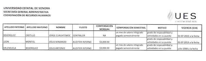 Hasta la fecha, el OIC de la Universidad no ha actuado de manera contundente al respecto de estás anomalías, quizás sea porque el personal que labora en este Órgano Interno de Control recibe compensaciones de parte del rector, un vicio de origen contemplado en los artículos 57 y 59 de la Ley Orgánica del Poder Ejecutivo del estado de Sonora y en el artículo 67 Quater de la Constitución Política de Sonora.