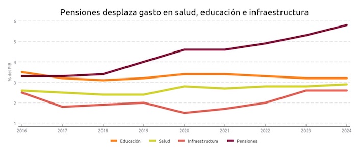 "Estamos gastando poco más de la quinta parte del presupuesto solo en pensiones y al final no tenemos una fuente de financiamiento estable para que cubramos ese gasto que está creciendo año con año porque la población está envejeciendo aceleradamente y porque hay una pensión no contributiva (programa social) que ha estado creciendo mucho", dijo Alejandra Macías, directora del Centro de Investigaciones Económicas y Presupuestarias (CIEP).