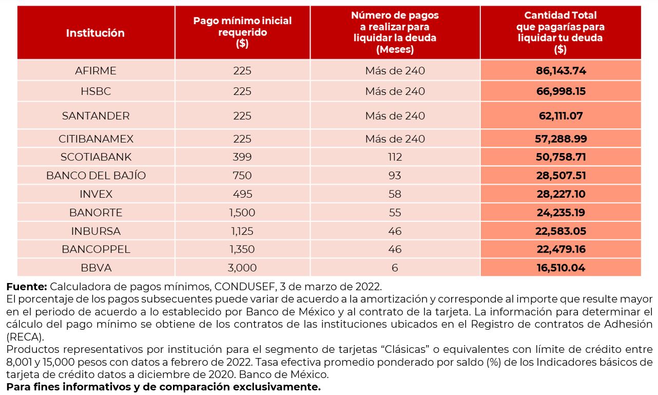 Por ejemplo, en un ejercicio realizado por el organismo en marzo de 2022 se mostró que entre las instituciones con la opción más alta y más baja, la diferencia fue de 69 mil 633.70 pesos. En el caso de la opción más alta, si siempre pagas el mínimo requerido, al final acabarías pagando casi seis veces más el monto prestado originalmente (15 mil pesos).