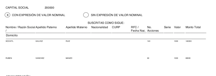 El primero data del 6 de mayo de 1998 cuando se constituye con 140 acciones para Bertha Xóchitl Gálvez Ruiz y 60 para Rubén Sánchez Manzo, su esposo. Ella quedó como apoderada y él como operador.