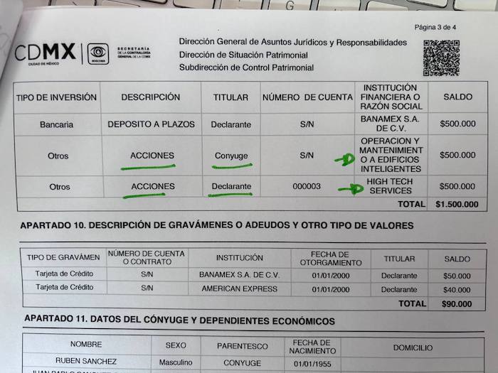 La primera declaración patrimonial que se cuenta es la que presentó el 30 de octubre de 2015 cuando inició su periodo como Delegada de Miguel Hidalgo. En el apartado de sus ingresos indicó que su esposo era “accionista de la empresa OMEI”. En el apartado de las inversiones, de nueva cuenta aparece que su esposo es el “accionista en OMEI”, ella únicamente en High Tech Services.