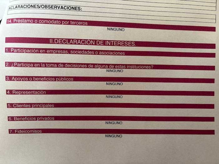 Informó sólo de sus ingresos por cargo público (1 millón 689 mil 328 pesos). Desaparece su participación en High Tech Services; desaparece la información de su esposo y desaparece el apartado de los conflictos de interés, en donde de nueva cuenta informó de ninguna de sus dos empresas familiares.