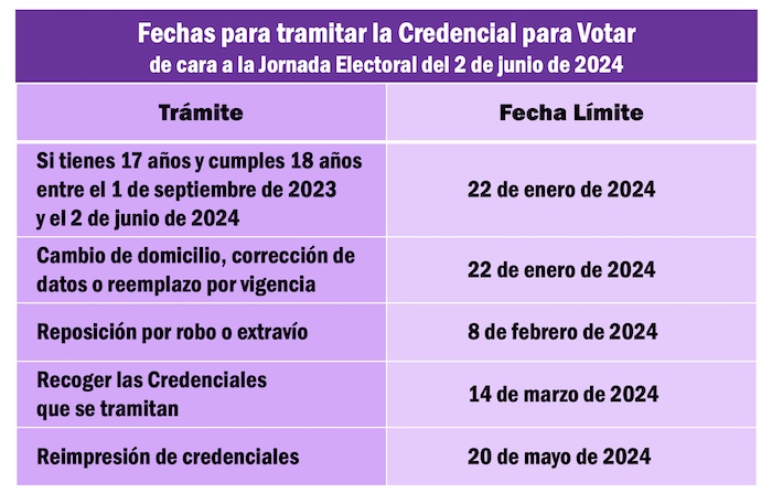 Otros plazos que se cumplen con respecto a la tramitación de la credencial de elector son el término para solicitar la reposición del documento por causas de robo o extravío, que se vence el 8 de febrero del 2024; quienes ya tramitaron su credencial tendrán como plazo máximo para recogerla el 14 de marzo del 2024 y quienes pretendan conseguir una reimpresión del documento, deberán acudir a alguna oficina del Instituto Nacional Electoral en cualquier estado del país, a más tardar el 20 de mayo de 2024.